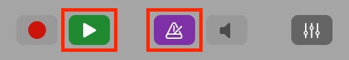 In the top-right corner of the MainStage window, are several buttons. The green Play/Stop button starts and stops playback within MainStage, and the purple Metronome button turns the metronome click on and off.