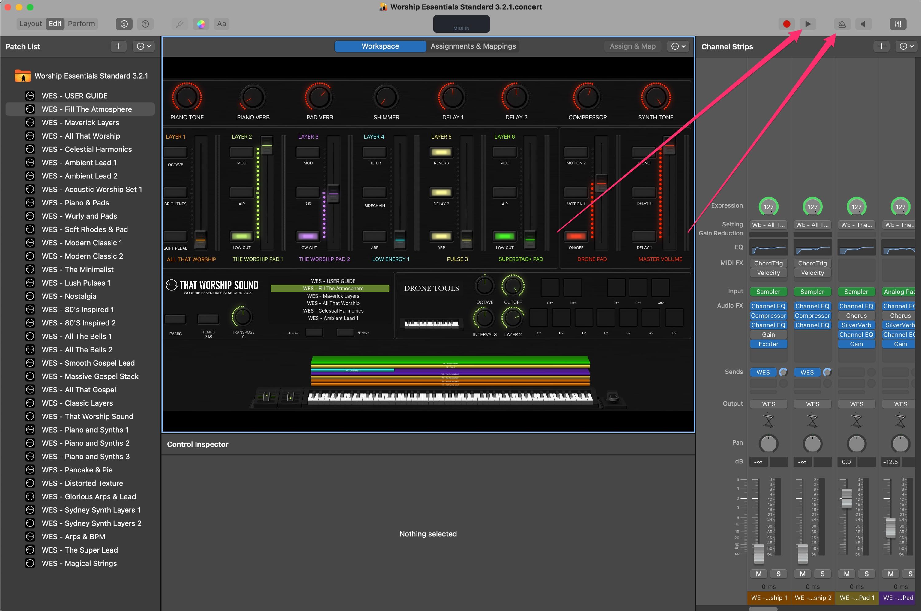 For example, when using our Essential Worship Loops product, triggering any loop playback starts the MainStage playback engine, and you will see the green Play/Stop button turn on. You can turn on the Metronome button to add a click track for the band!