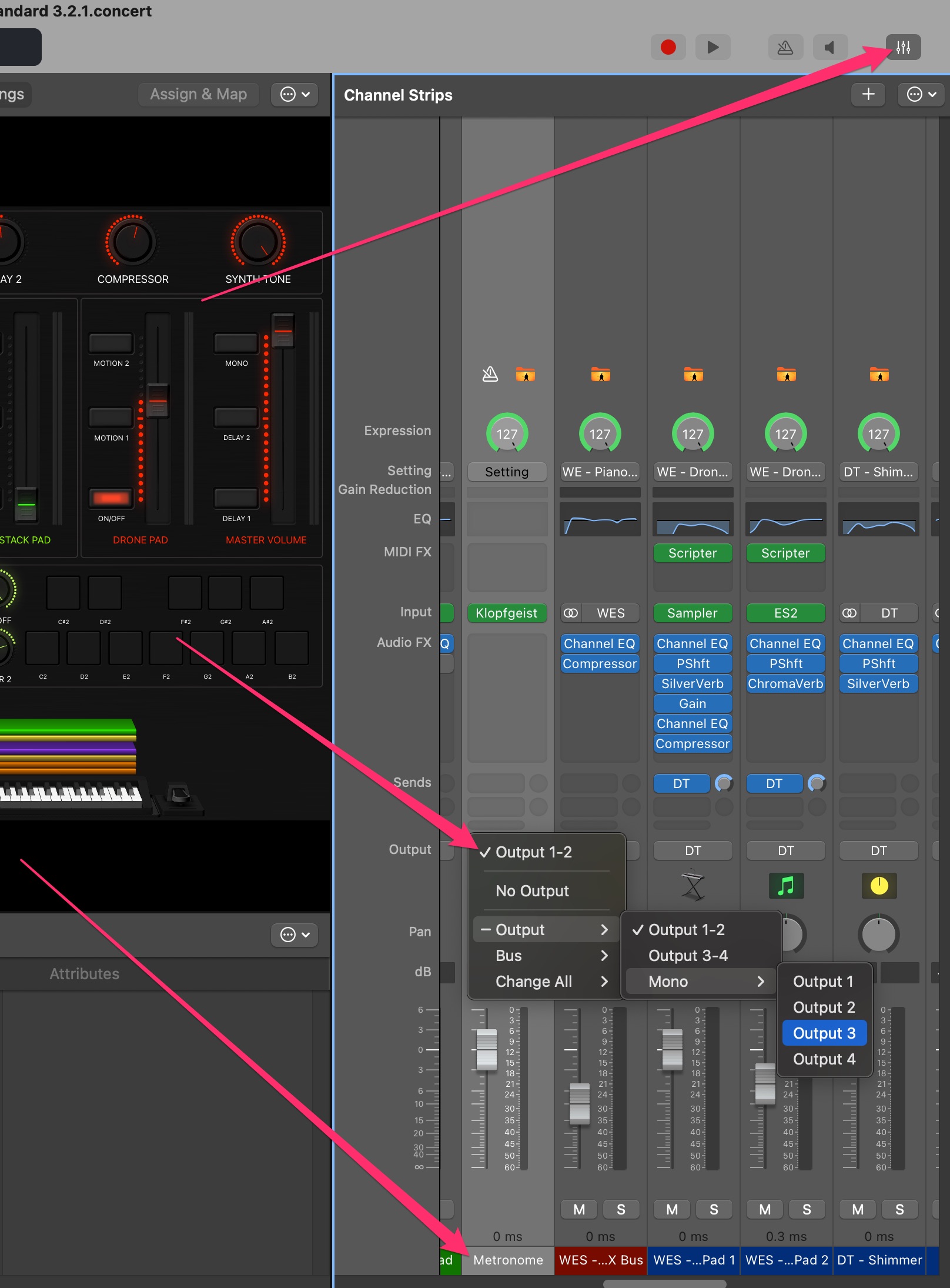 To route the Metronome to a different output in your audio interface, click the Channel Strips button to show the channel strips on the right side of the screen, and find the one labeled "Metronome". Then, simply change the output to a different one than used by your keys sounds - i.e. Keys on Outputs 1-2, and Metronome on Output 3. If you only have 2 outputs, put your Keys on Output 1 and Metronone on Output 2 (L and R if using the headphone jack).
