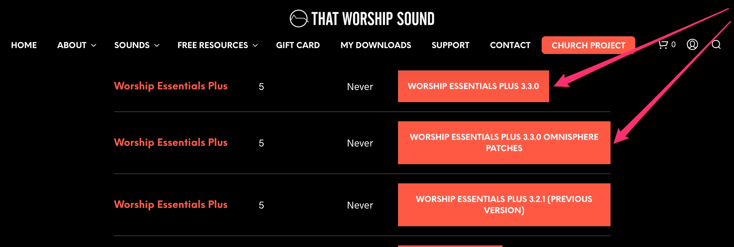 - Click on the red download button for "Worship Essentials Plus 3.3.0" and "Worship Essentials Plus 3.3.0 Omnisphere Patches".